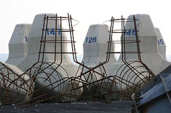 もしかしたら、私以外にもこんな「巨大テトラポッド」に見とれる人がいるかもしれないので、テトラポッドの「骨」や、立体十字型テトラポッドの生産工場の写真を下に貼り付けておきます。なんだか、立体十字型テトラポッドが、太平洋に浮かぶイースター島で、水平線の彼方を眺めるモアイ像のように見えてくるのは私だけでしょうか?