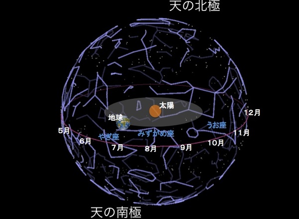 天球の手前側にある星座がひっくりかえるし、遠くにあるはずの天球が近いようにも見えます…。地球の夜側が昼に見えてしまいますし。地球を太陽の向こう側に置いて、天球の奥側を濃くして手前側を薄くするのはどうですか?